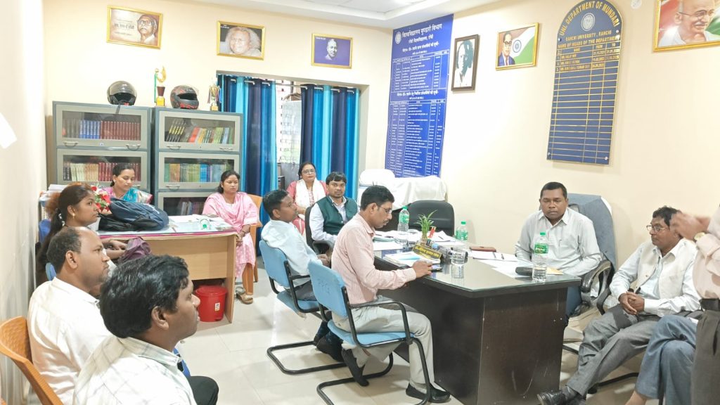 रांची: रांची विश्वविद्यालय के मुंडारी विभाग में नई शिक्षा नीति (NEP) के अनुरूप सिलेबस निर्माण और साहित्यिक गतिविधियों को सशक्त बनाने के उद्देश्य से विभागाध्यक्ष डॉ. वीरेंद्र कुमार सोय की अध्यक्षता में एक महत्वपूर्ण बैठक आयोजित की गई। इस बैठक में मुंडारी भाषा के भारतीय ज्ञान परंपरा (Indian Knowledge System – IKS) से संबंधित सिलेबस पर गहन विचार-विमर्श किया गया और इसके प्रारूप को अंतिम रूप देने पर चर्चा हुई। बैठक की शुरुआत शोधार्थियों द्वारा स्वागत गीत प्रस्तुत कर की गई। तत्पश्चात विभागाध्यक्ष डॉ. सोय ने सभी अतिथियों का स्वागत करते हुए बैठक का विषय प्रवेश कराया। उन्होंने कहा कि “मुंडारी साहित्य और संस्कृति के संरक्षण के लिए अब अकादमिक स्तर पर संगठित प्रयास की आवश्यकता है।